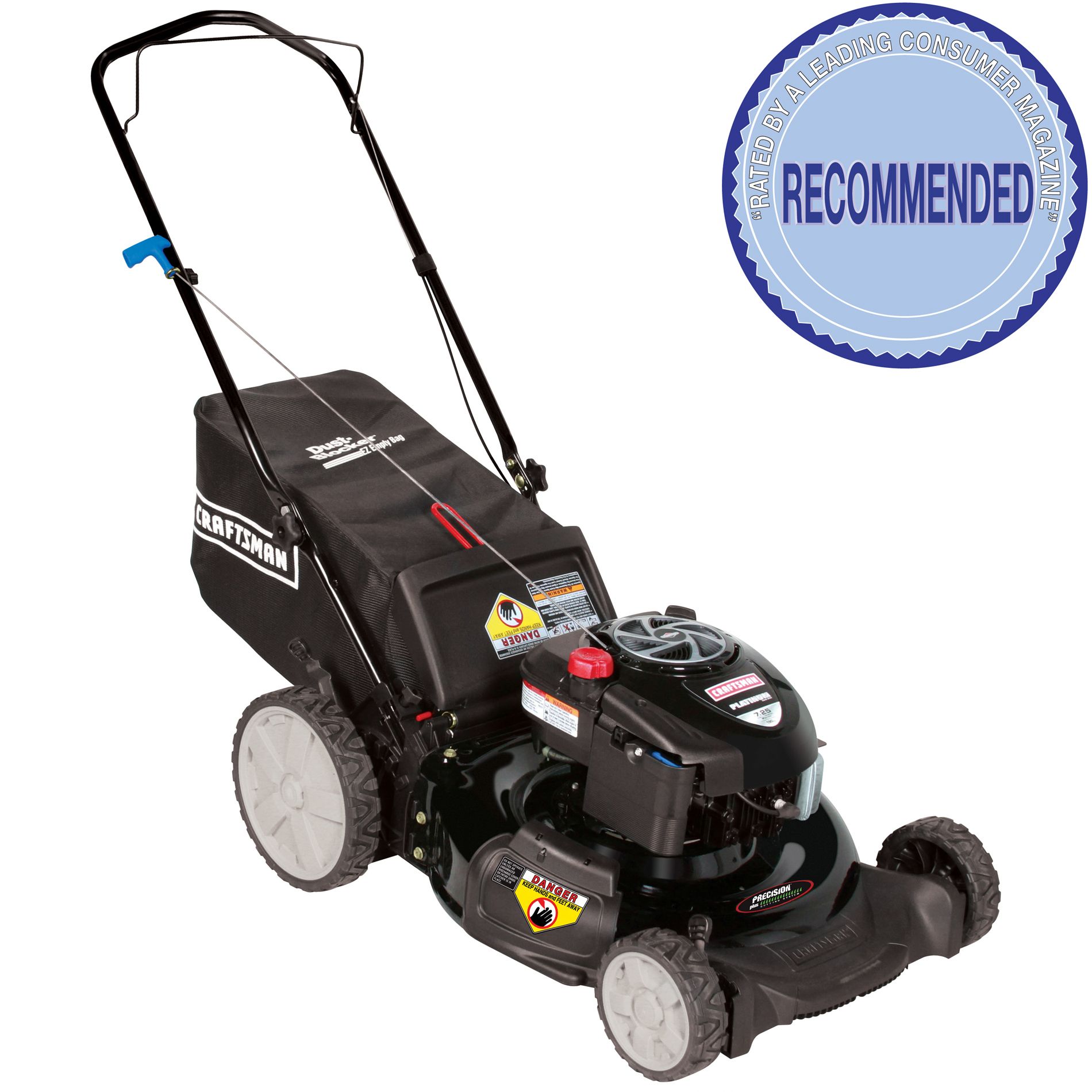 This Yard Mower is Built for Fast Pace CuttingBuilt for a precise trim, this Craftsman yard mower features an extended cutting area that reaches beyond the wheels, so whether you re trimming along a side walk, garden path or flower bed, you have the reach you need to snip every blade exactly. Designed to suit your cutting style, it swaps between bagging, mulching and side discharge, while the simple height adjustments go from 1.25 to 3.75 inches with ease. Built to make getting the grass cut easier and more comfortable, this lawn mower features an EZ empty Dust Blocker ... Read more