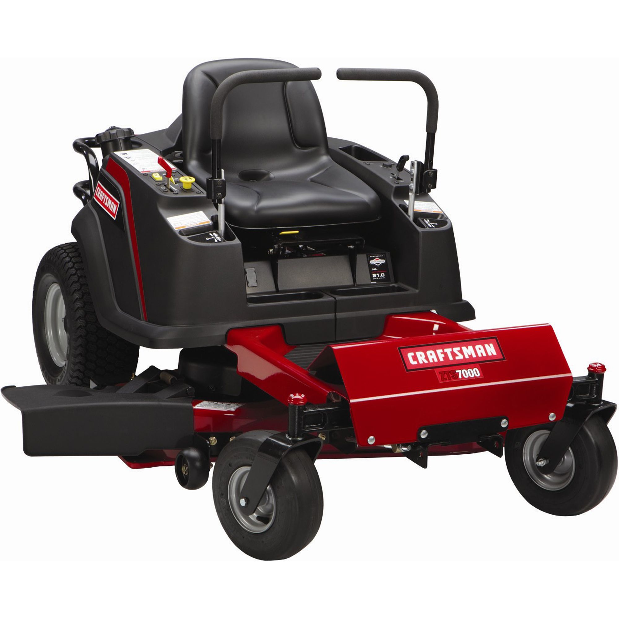 This fun-to-drive mower offers the best of both worlds, the maneuverability of a zero-turn mower and the dependability of a Craftsman. The new look and feel was designed with you in mind. With its ability to turn 360 degrees, you will look forward to mowing the lawn. Cut around trees and obstacles with total control and in open areas, turns are quick and precise. You will be done in no time. The ZTS7000 comes equipped with a 21 hp Briggs & Stratton Platinum Series engine. Other features include electric push button blade engagement, 3-gallon fuel tank, and cast-iron ... Read more